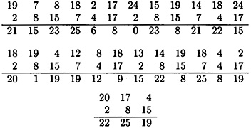 We convert the plaintext elements to residues modulo 26, write them in groups of six, and then add the keyword modulo 26, as follows: