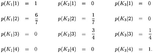 . This can be verified directly by applying the definition of conditional entropy, as follows. First, we need to compute the probabilities p(Ki|j), 1 ≤ i ≤ 3, 1 ≤ j ≤ 4. This can be done using Bayes Theorem, and the following values result: