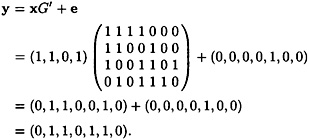Now, suppose Alice encrypts the plaintext x = (1, 1, 0, 1) using as the random error vector of weight 1 the vector e = (0, 0, 0, 0, 1, 0, 0). The ciphertext is computed to be