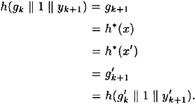 PROOF Suppose that we can find x ≠ x′ such that h*(x) = h*(x′). Given such a pair, we will show how we can find a collision for h in polynomial time. Since h is assumed to be strongly collision-free, we will obtain a contradiction, and thus h* will be proved to be strongly collision-free.