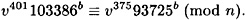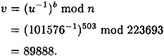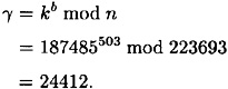 Suppose the TA chooses p = 467 and q = 479, so n = 223693. Suppose also that b = 503 and Alices secret integer u = 101576. Then she will compute
